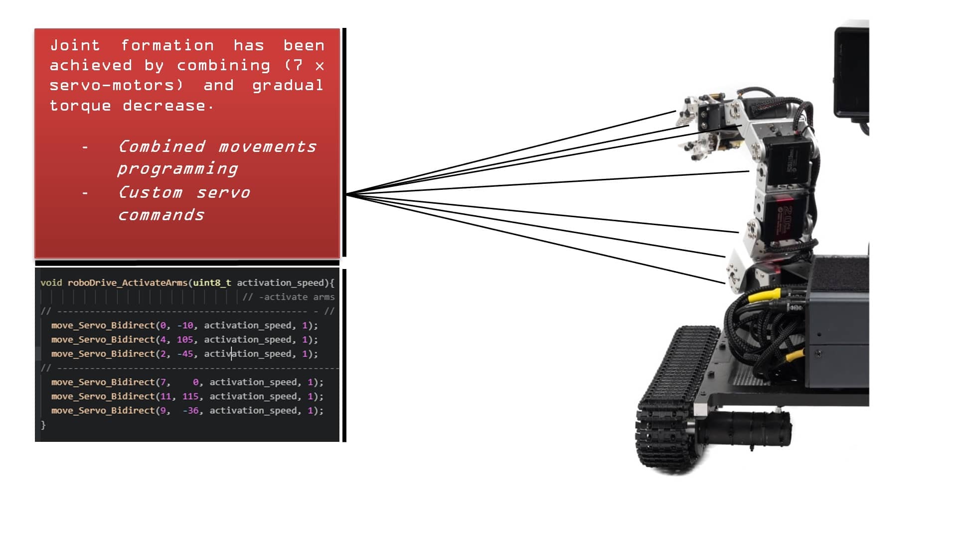 High flexibility of “Mecha-Arms v1” is programmed over the roboDrive Engine, and commands are sent to robot inside a console. It is possible to control complete arm, or a single part of the arm, that is a servo-motor. The operator has access to arm via console in real-time. Running complex movements including multiple servo-motor behaviors, also connecting to single servo-motor on each arm is possible.