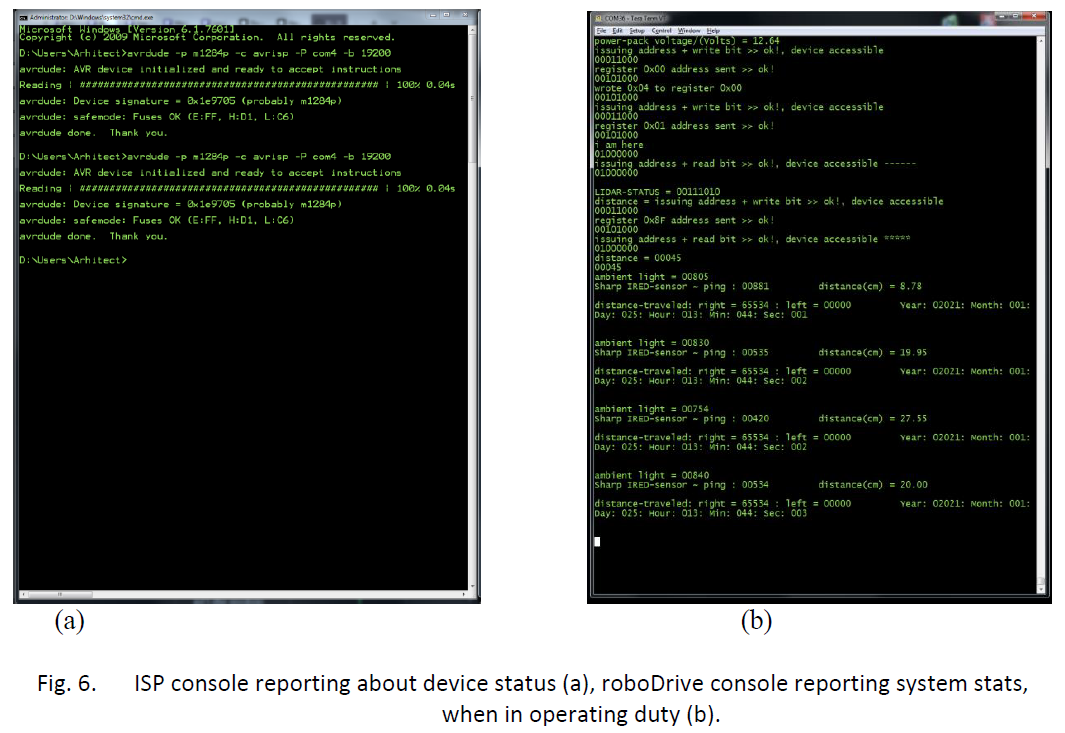 Once in a while roboDrive console reports robot’s and system’s stats over USB-UART bridge. As seen in Fig. 6 (b), it lets you know the actual power-supply voltage level, then reports the status of the onboard LIDAR, distance measured, including ambient lightning conditions, date and time and so on. Further parameters can be added or removed, or saved to a file for further evaluation inside the compute module.
