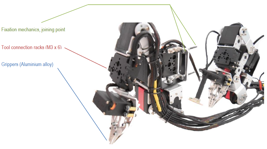 Not only, it is possible to program arms for repetitive and precise movements, but also working with each arm remotely in real-time, while controlling the robot. Manipulators are very flexible devices, and are capable of fine-tuned movements. Additionally user can add sensors, lightning or cameras to the racks on both arms Fig. 7.