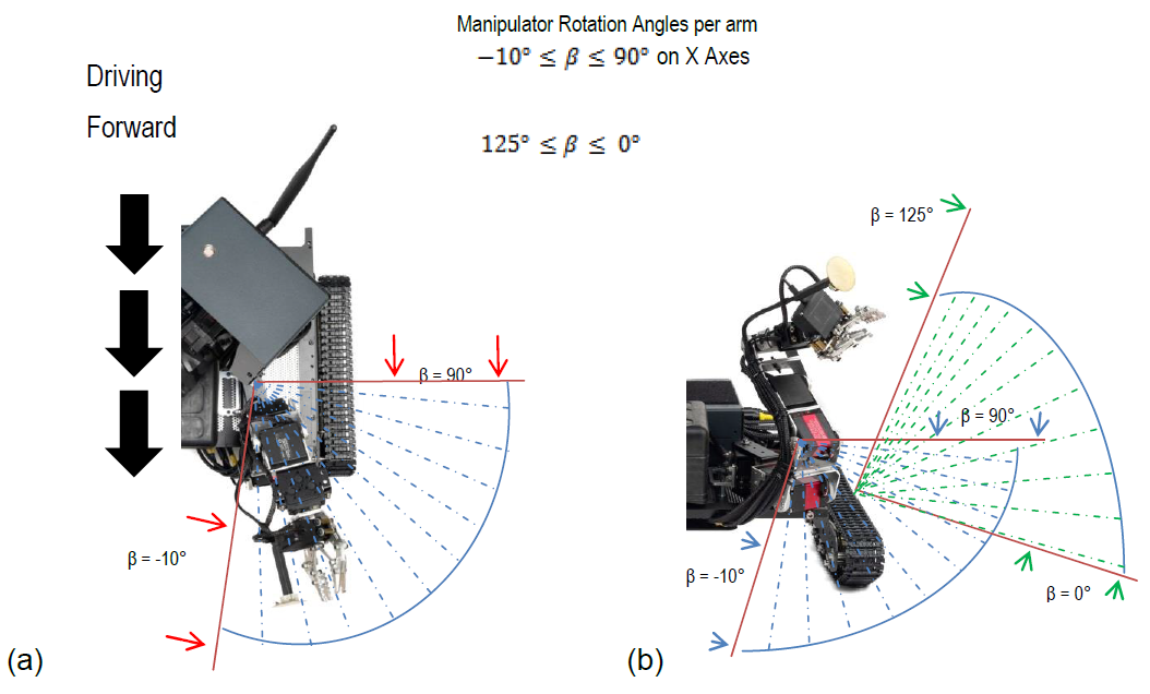 Manipulators can move unconstraint over several axes as illustrated in Fig. 8 (a) and (b). Rotations are achieved by one or several servo-motors synchronized behavior. In Fig. 8 (a), the manipulator can be moved in range of (-10°) till (90°) on X-Axis.