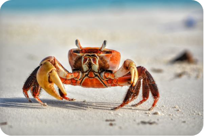 Ocean crabs are very unique which comes to their natural body shape allowing them to stay stable and employ their pincers even when the waves emerge, its lower positioned core and legs located sideways help them run extremely fast on sand and in rocks. Front positioned pincers and eyes work perfectly together to look for food or dig burrows. As human I doubt that I can catch a crab on a sandy beach.