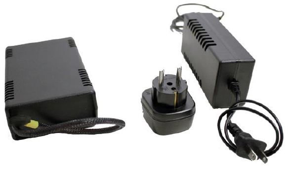 Fig. 11. Rechargeable battery module (left), charger with US socket and EU adapter (right).